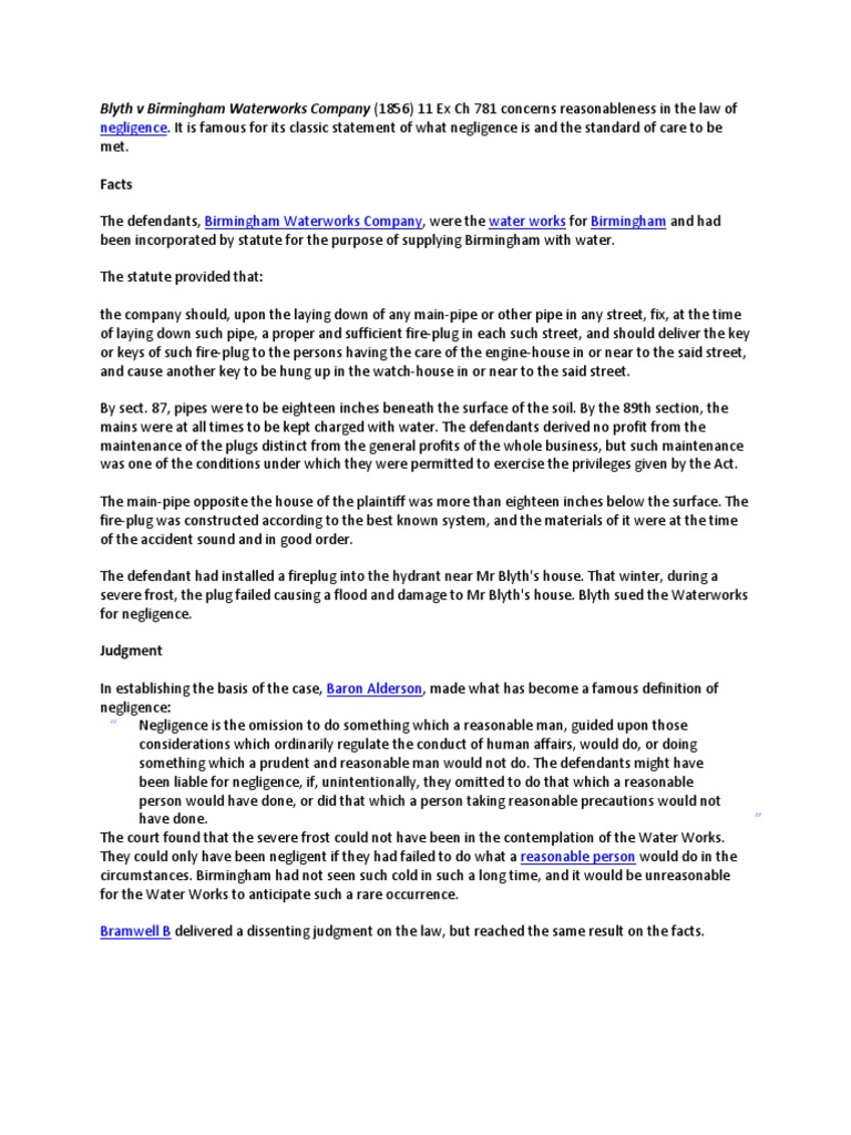 Blyth v Birmingham Waterworks Company 1856 11 Ex Ch 781 1 concerns reasonableness in the law of negligenceIt is famous for its classic statement of what negligence is and the standard of care to be met. Defendants had installed water mains in the street with fire plugs at various points some 30 years ago. 1047 Date decided 1856 Facts.